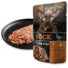 La base de este alimento es un exquisito paté de pato complementado con carne desmenuzada de ternera. Ambos tipos de carne se cocinan de manera suave para preservar su jugosidad y mantener intactos los nutrientes esenciales. El método de cocción cuidadoso garantiza que cada porción conserve el máximo sabor natural de los ingredientes, evitando el uso de potenciadores artificiales.