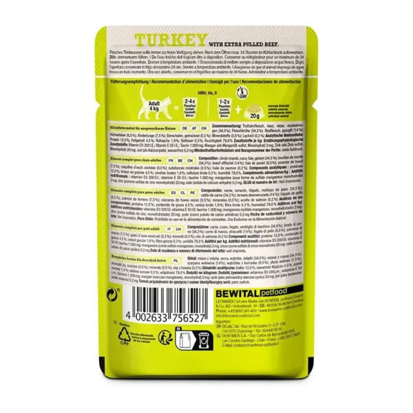 LEONARDO Turkey + extra Pulled Beef es un alimento completo, formulado para cubrir todas las necesidades nutricionales de los gatos adultos. Su alto contenido en proteínas de origen animal favorece la masa muscular, mientras que las grasas saludables proporcionan energía y contribuyen a una digestión equilibrada. Estos beneficios hacen que este producto sea ideal tanto para gatos activos como para felinos con hábitos más tranquilos.