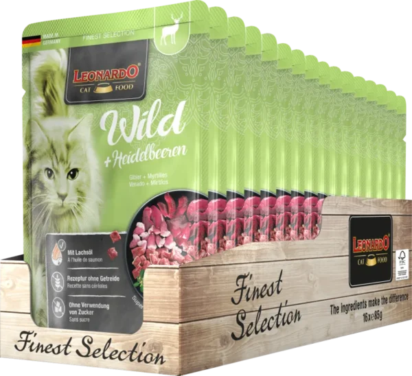 LEONARDO Venado + Arándanos es un alimento húmedo premium diseñado para gatos adultos que buscan una experiencia gastronómica diferente, equilibrada y nutritiva. Su fórmula combina carne de venado de alta calidad, baja en grasas y muy digestible, con aves de corral cuidadosamente seleccionadas para aportar suavidad, sabor y proteínas adicionales. Esta mezcla se completa con arándanos azules afrutados, ingredientes ricos en antioxidantes naturales que contribuyen al bienestar integral del felino. El resultado es un alimento equilibrado, jugoso y atractivo incluso para los animales más exigentes.